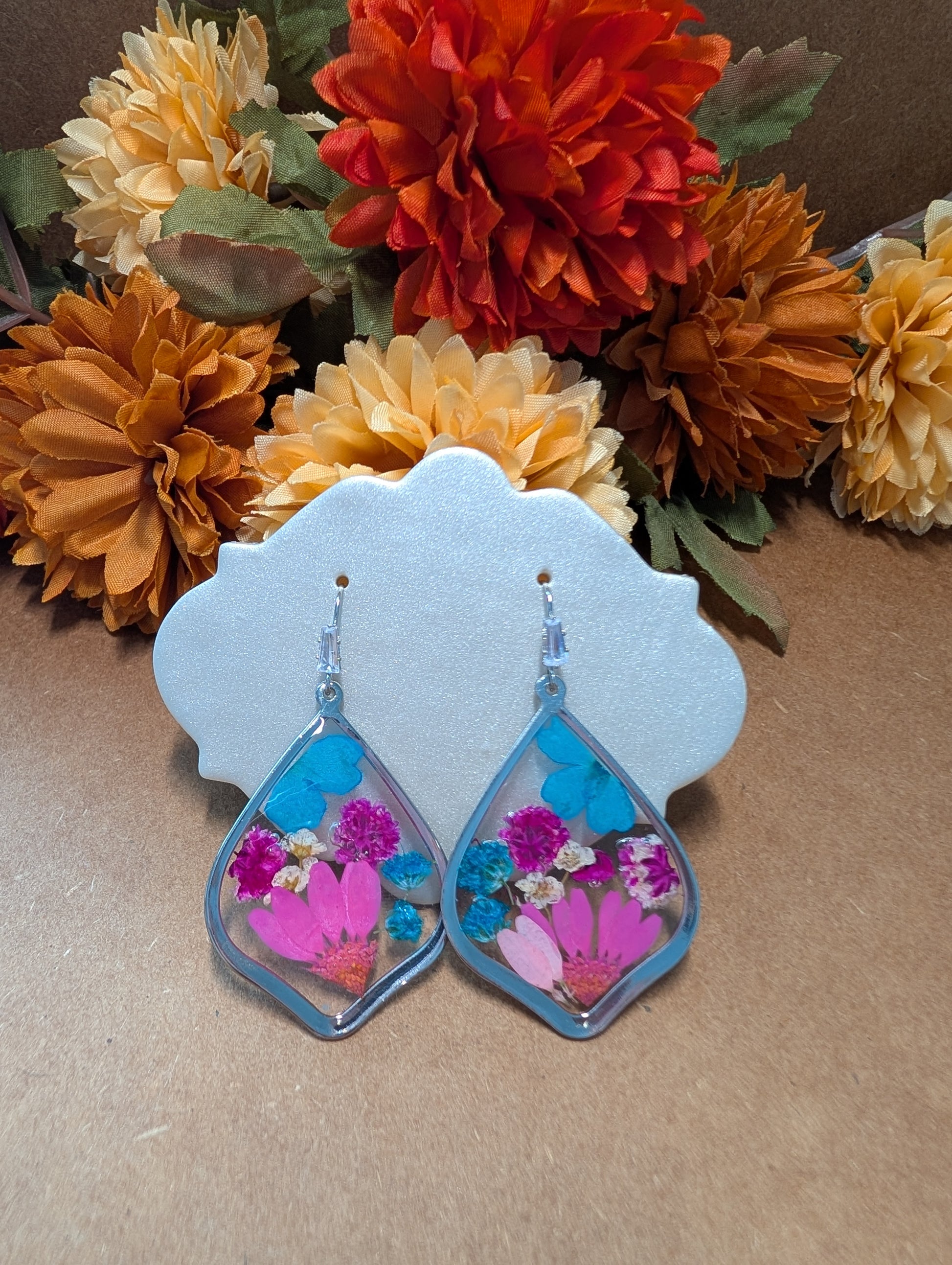 Earrings made with resin and dried flowers on a silver hook.